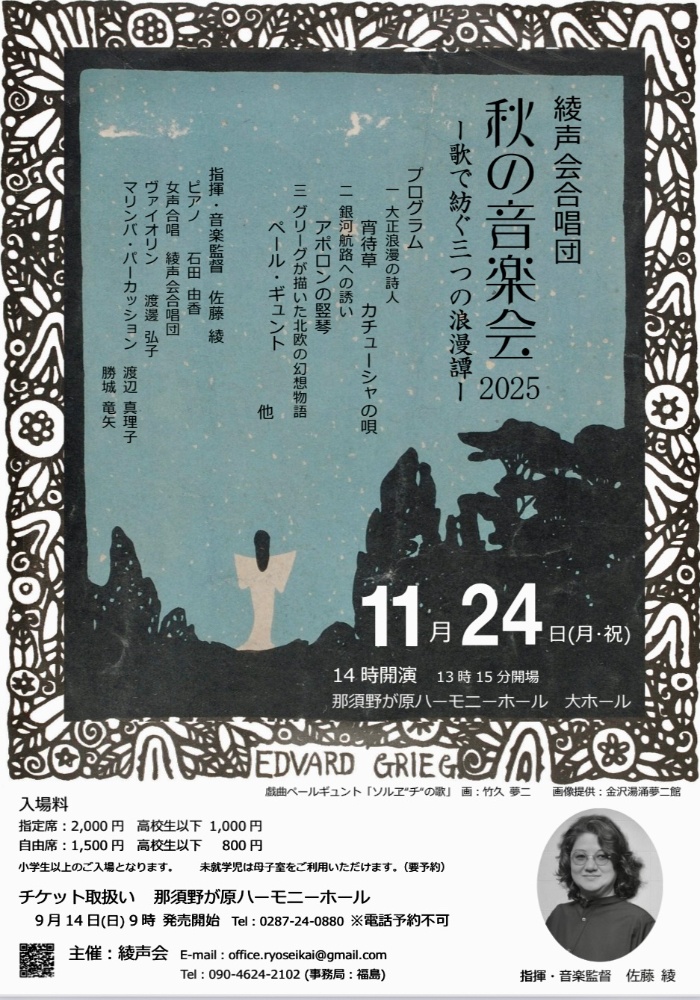 竹久夢二ら大正浪漫の粋に酔い、宮沢賢治とみなづきみのりによる銀河の大海に身を委ね、管弦楽やピアノで演奏されることの多い「ペール・ギュント」のオリジナル女声合唱版で自分探しの冒険へ。晩秋のひととき、どうぞ会場にてお楽しみいただければ幸いです。