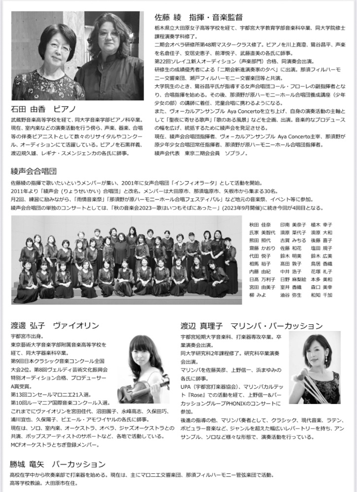 「綾声会」は声楽家、合唱指揮者である佐藤 綾と、自身が音楽監督を務める合唱団のメンバー、および演奏活動を支えてくれる仲間たちで構成されたグループの総称です。