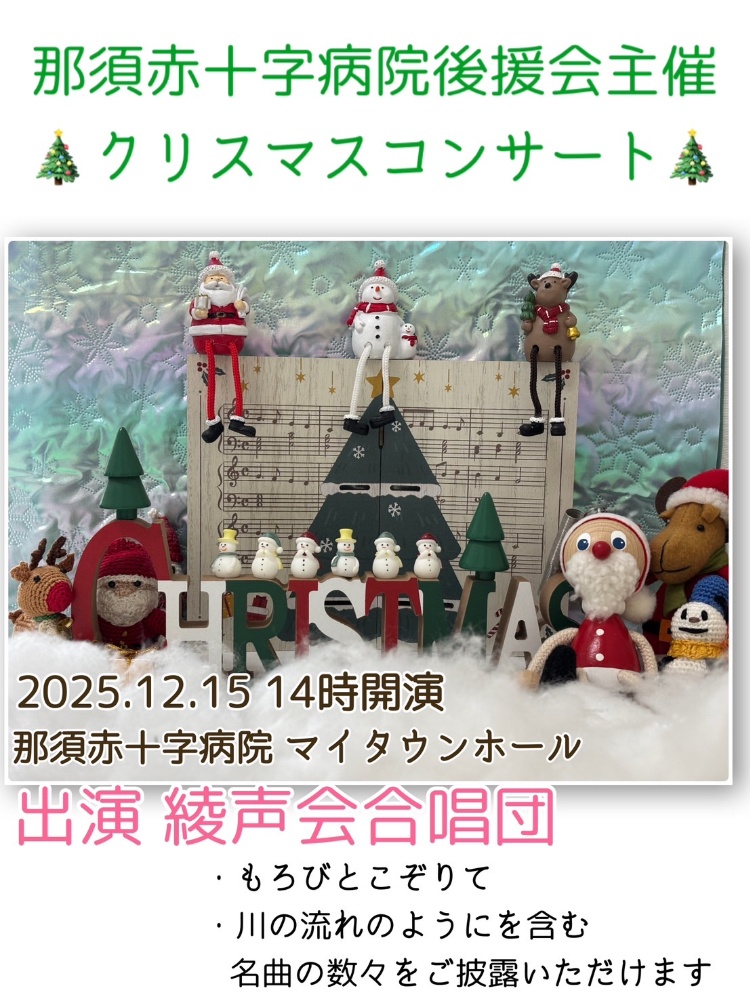 2025年12月15日午後14:00より、那須赤十字病院内マイタウンホールにて開催されるクリスマスコンサートに出演させていただきます。